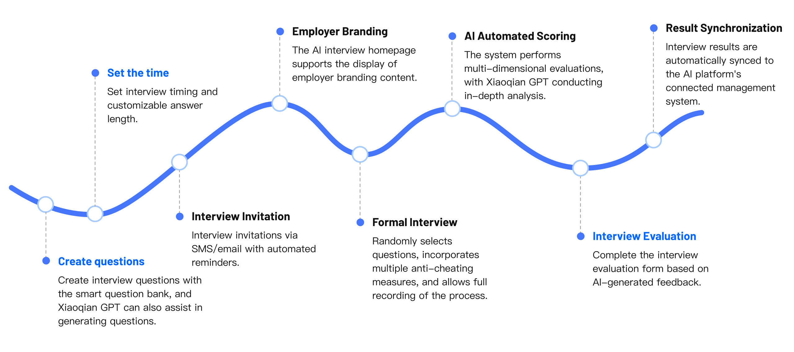 MoSeeker AI Interview enables online self-service interviews, helping hiring organizations efficiently assess candidates’ abilities with both fairness and accuracy. It can be seamlessly integrated with various ATS and HCM systems, handling both campus recruitment and lengthy social recruitment processes with ease. Recruiters only need to configure the process in advance, and candidates can start their interviews anytime, anywhere, completing the entire process independently. The AI algorithms provide multidimensional assessments of candidates’ performance.