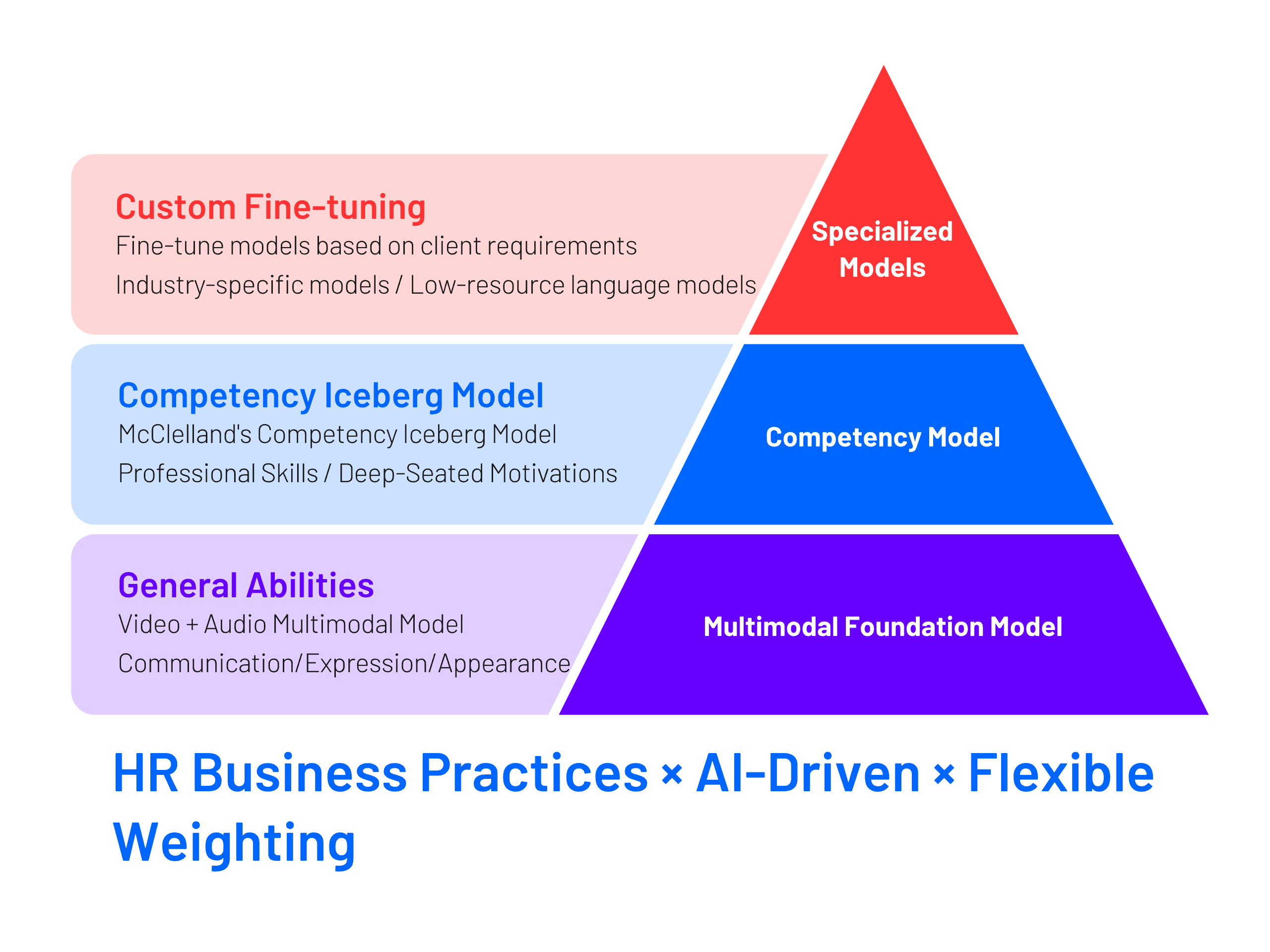 The AI interview system employs a comprehensive scoring framework that integrates basic multimodal, competency-based, and domain-specific models. Candidates are evaluated on multiple dimensions, including image (appearance), voice (speech), and content (text), allowing for in-depth talent assessment. By adhering to standardized evaluation criteria, the system helps minimize unconscious bias.
