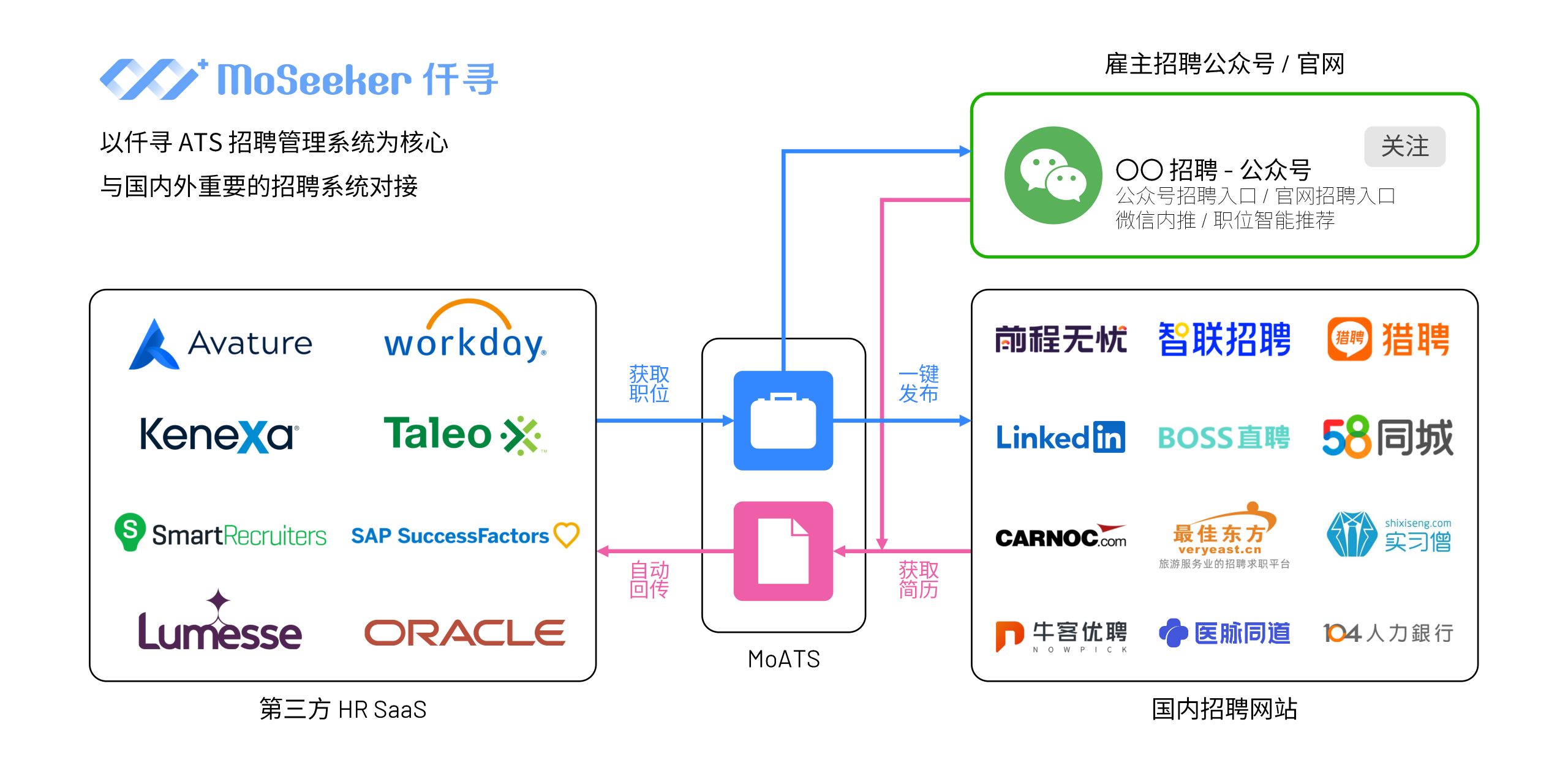 仟寻 ATS 招聘管理系统作为枢纽,与国内外主流 HR 系统无缝对接,解决流程割裂、系统散乱、数据合规等问题。我们与国际头部厂商建立战略合作关系,推出标准集成方案,打通本土与海外场景壁垒。