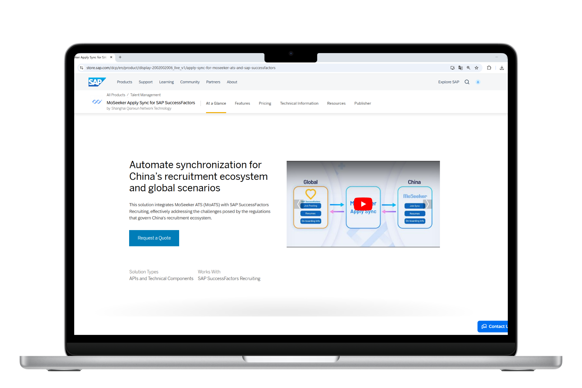 SAP SuccessFactors 的招聘模块与仟寻 ATS 招聘管理系统,依托标准招聘集成解决方案,可进行无缝对接,打通海外和中国本土的使用场景,建起流畅且安全的数据通道,助企业更好地融入中国本地的招聘生态,降低违规风险,同时保障全球招聘架构的统一。该集成方案已通过 SAP 审核,上架官方应用商店。