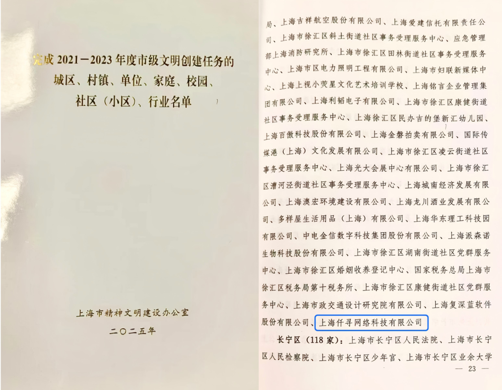 近日,上海市精神文明建设办公室下发《完成2021-2023年度市级文明创建任务的城区、村镇、单位、家庭、校园、社区(小区)、行业名单》,仟寻网络科技有限公司顺利完成 2021-2023年度市级文明单位创建任务,获评“上海市文明单位”光荣称号。这份含金量极高的集体荣誉是对仟寻精神文明建设工作的充分肯定,也是全体仟寻人同心同德、奋楫前行的有力见证。