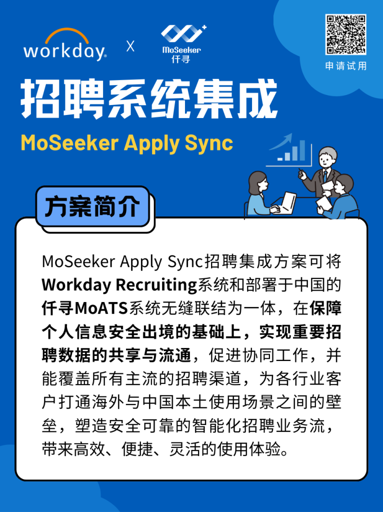 “”MoSeeker 和 Workday 之间的合作始于 2021 年。我们是 Workday 在中国大陆招聘领域里第一个获得集成认证的合作伙伴。跨国公司在中国使用海外招聘系统时常常面临挑战,导致出现人岗不匹配的问题,“仟寻创始人及 CEO 王向导说道, ”我们的解决方案,在数据合规、流程、用户偏好、产品特性、系统集成等方面与中国本地招聘生态保持一致,借此解决这些核心痛点,最终为中国候选人创造卓越的使用体验。”