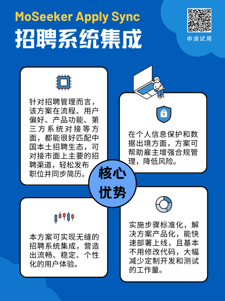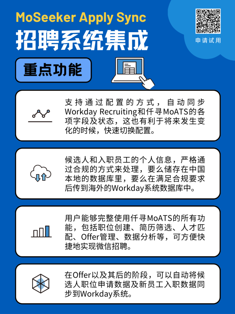 这是全球领先的人力资源和财务管理软件供应商 Workday 与仟寻深度合作的又一重大里程碑时刻。依靠 MoSeeker Apply Sync,不仅可实现重要招聘数据的共享与流通,加强个人信息跨境传输的安全性,促进协同工作,还能覆盖所有主流的招聘渠道,帮助客户跨越横亘在海外与中国本土使用场景之间的藩篱,以塑造安全可靠的智能化招聘业务流,为用户带来高效便捷的体验。